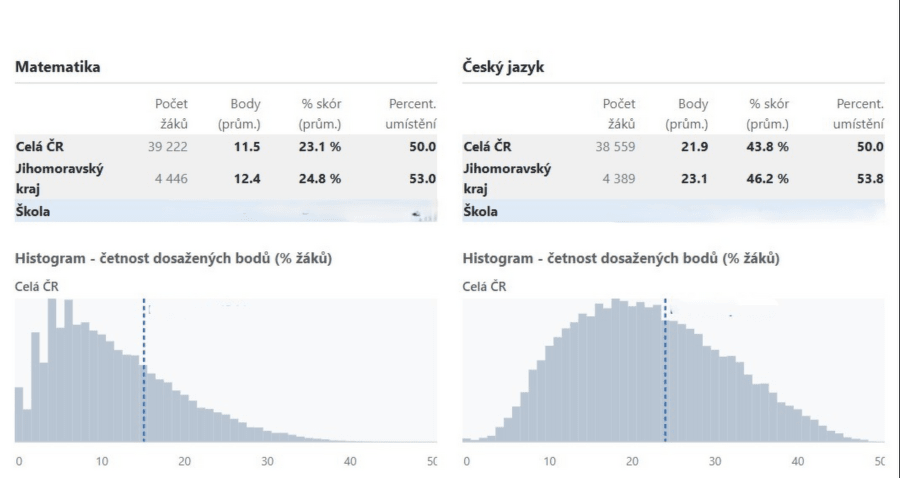Přijímačky nanečisto měly školám pomoci připravit žáky na jednotnou přijímací zkoušku (JPZ). Letos ale dopadly podobně špatně jako loni: nejčastější výsledek z matematiky je jen pět bodů, průměr 11,5 z 50. Přitom 90 a více procent dosáhlo pouze 9 žáků z celkových 39 tisíc, kteří test psali: 2 žáci měli 100% skóre, 2 žáci měli 96% skóre, 1 žák měl skóre 94 %, 1 žák 92 % a 3 žáci měli skóre 90 %.